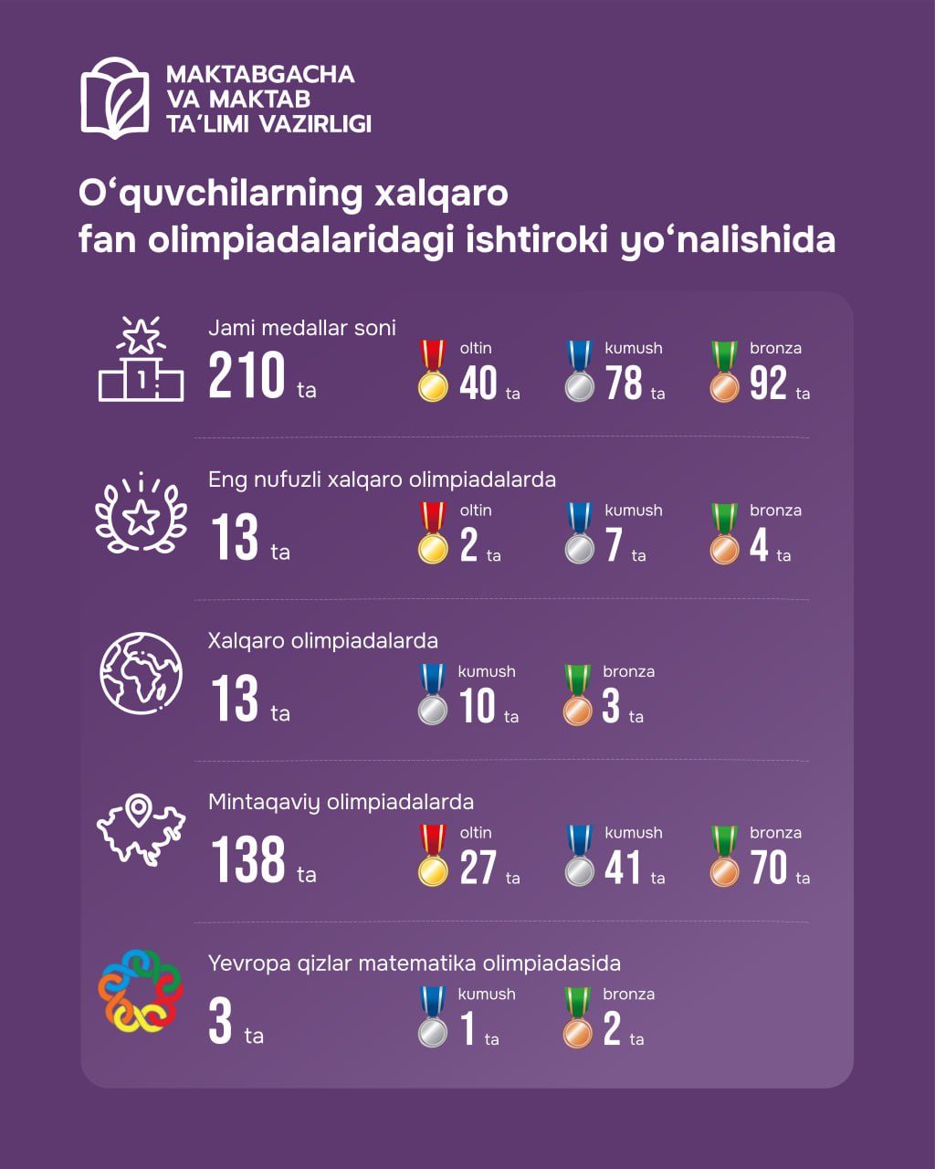 Oʻquvchilarning xalqaro fan olimpiadalaridagi ishtiroki yoʻnalishida 👉 2025-yilda yurtimiz oʻquvchilari 29 ta xalqaro olimpiadada munosib ishtirok etdi va 210 ta medal... 3 kun avval 3