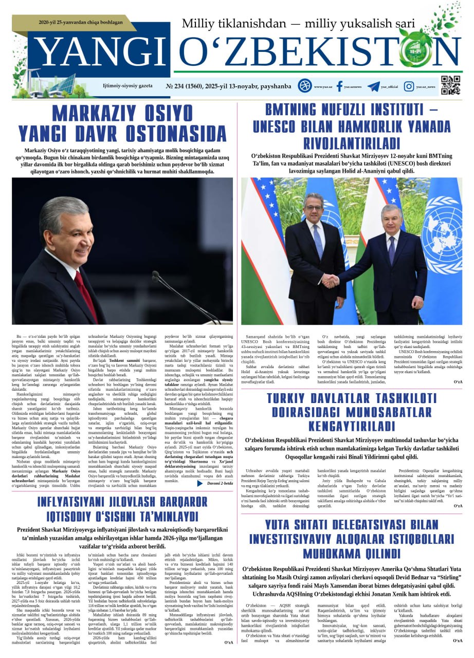 Markaziy Osiyo yangi davr ostonasida O‘zbekiston Respublikasi Prezidenti Shavkat Mirziyoyevning “Yangi O‘zbekiston” gazetasining bugungi sonida “Markaziy Osiyo yangi davr ostonasida”... 1 hafta avval 13