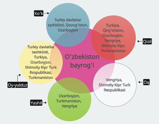 Oʻqituvchi: Endi darsimizni Venn diagrammasi usulida davom ettiramiz. Avval besh guruhga bo‘linib olaylik. Guruhlarimizni bayroqdagi ramz va ranglar bilan “Ko‘k”, “Qizil”, “Oq”, “Yashil” hamda “Oy va yulduzlar” deb nomlaymiz. Har bir guruh o‘z nomidagi rang yoki ramzni qardosh davlatlarning bayroqlaridan topib, Venn diagrammasiga joylashtiradi. 3 daqiqa vaqt beriladi. Qani, boshladik!