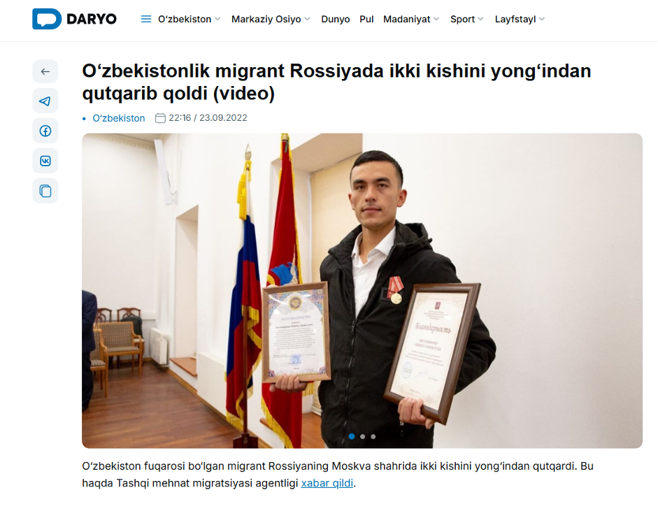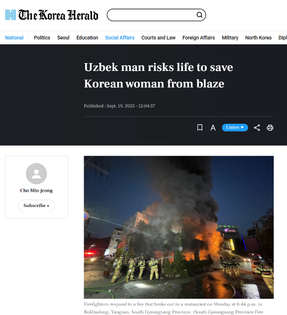 Mana bu bir hamyurtimiz haqida Koreya sayti yozgan maqola. 2023-yil Janubiy Koreyaning Yangsan shahrida o‘zbekistonlik erkak yong‘in ichida qolgan 69 yoshli koreyalik ayolni qutqardi, deb yozmoqda ushbu sayt. Ushbu qahramonlik butun Koreyada o‘zbekistonliklar haqida ijobiy fikr uyg‘onishiga sabab bo‘ldi.