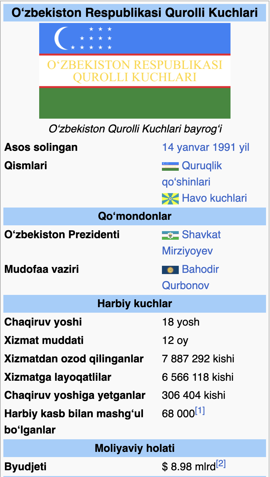 “Global Firepower”ning 2025-yilgi dunyodagi eng kuchli armiyalar reytingida O‘zbekiston 145 ta davlat orasida 58-o‘rinni egalladi.