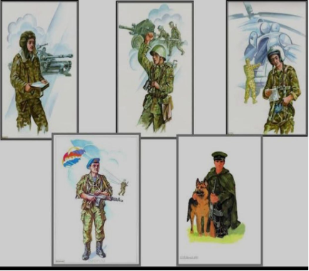 Tarbiyachi: Bu rasmlardagi akalarimizning barchalari harbiy. Ammo yaxshilab kuzatadigan bo‘lsangiz, ularning liboslari turlicha. Sababi, ular bajaradigan vazifa bir-biridan farq qiladi. Sizlarga harbiy qo‘shin turlari haqida gapirib beraman. Qani menga aytinglar-chi, qanday harbiylarni bilasiz?