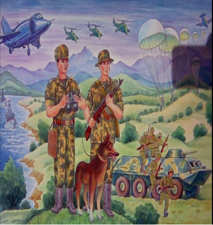 Tarbiyachi: To‘g‘ri, askarlar tinchligimiz, osuda hayotimiz posbonlari. Ular harbiy mashqlarni bajarishadi, jismonan sog‘lom va jasur bo‘lishadi. Mana bu rasmlarga qarang.